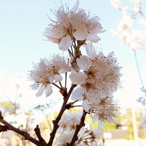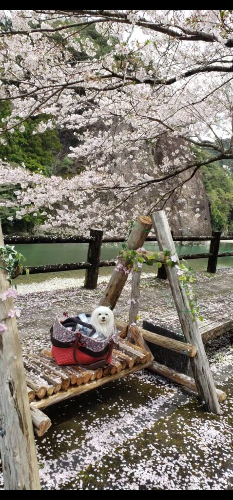 桜吹雪の中、桜の絨毯と一枚岩と愛犬のコラボです。