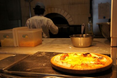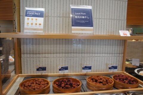 手作り生地を使った焼きたてピザや、揚げたての天ぷら、すし、地元の梅干しコーナーなど、見ているだけでも楽しい空間です。