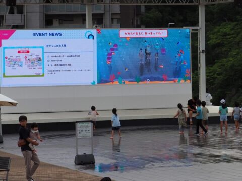 噴水タイムの合間には、舞台の大画面に自分の姿が映ります。