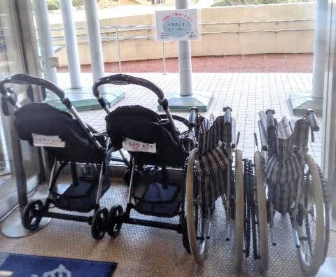 入ってすぐのところに、無料で使えるベビーカーと車いすを置いてくれています。