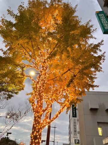 ケヤキやイチョウ、クスノキが植えられた、緑豊かな並木道。イルミネーションが始まった11月には、木々が紅葉していました。
