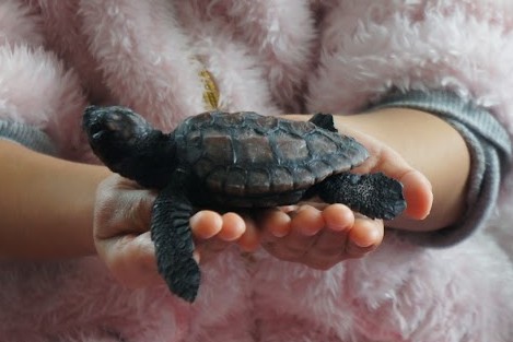 娘がウミガメの赤ちゃんを手のひらで抱える様子を、祈るような気持ちで見守っていました。