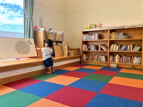 カラフルなカーペットが敷かれている「おはなしコーナー」は、靴を脱いでリラックスしながら絵本を読めるスペースです。