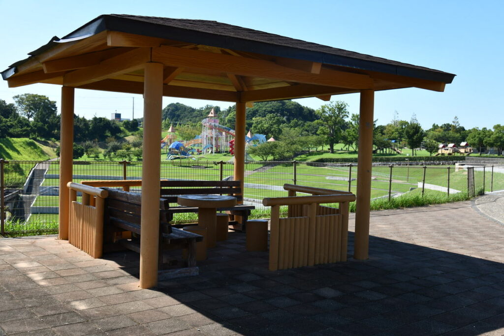 新庄総合公園には所々に屋根付きのあずまやがあります。ただし、駐車場の広さや公園の収容人数から考えると少なめ。ランチタイムともなると、あふれてしまうこともあります。