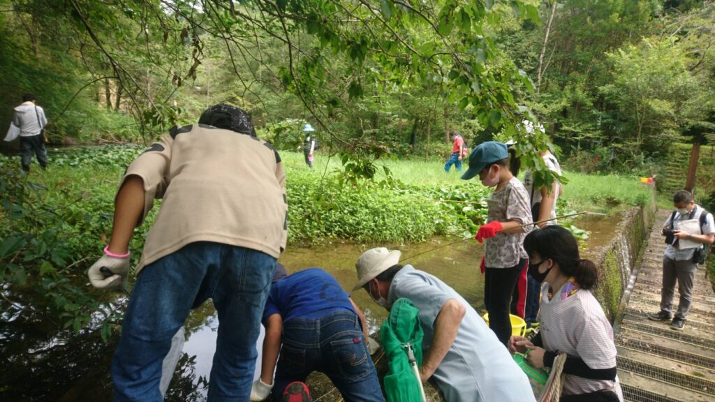 スルメをえさにしたザリガニ釣りでは、知恵比べ。