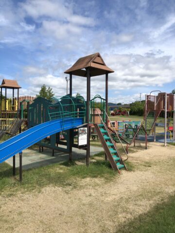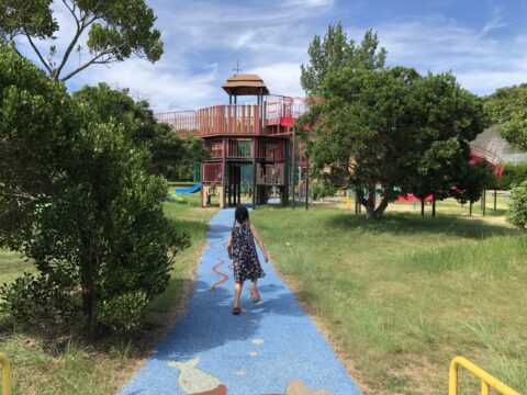 こちらの公園には滑り台のある大型遊具、小さな滑り台、ブランコや鉄棒、砂場があり、よちよち歩きの幼児から小学生まで幅広い年齢の子どもたちが楽しめます。上富田町は熊野古道・中辺路ルートの入り口という土地柄から、古道をテーマにした遊具もあります。