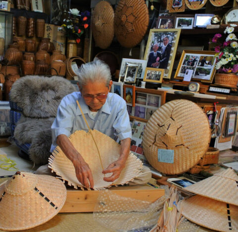 この笠は、田辺市本宮町皆地で平安時代から作られてきました。かつては集落内で作業工程を分担して量産していましたが、今は作る技術を持っているのは芝安雄さんただ1人となりました。芝さんは2021年1月に100歳を迎えますが、現役の職人として笠を作り続けています。その製品は、実用品でありながら工芸品の域に達し、インテリアとして買い求める人も少なくありません。