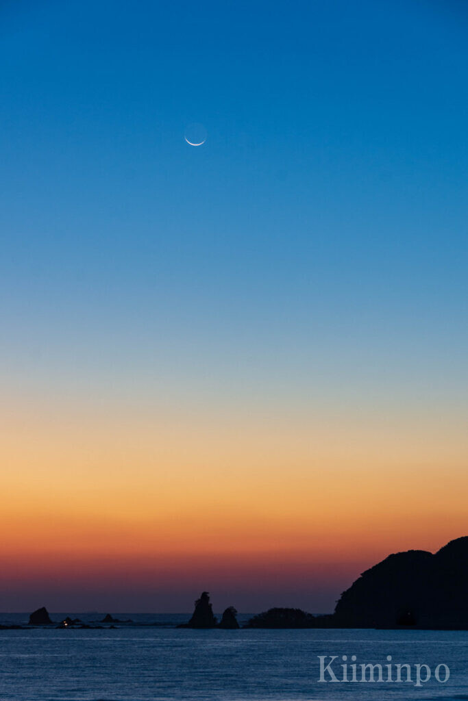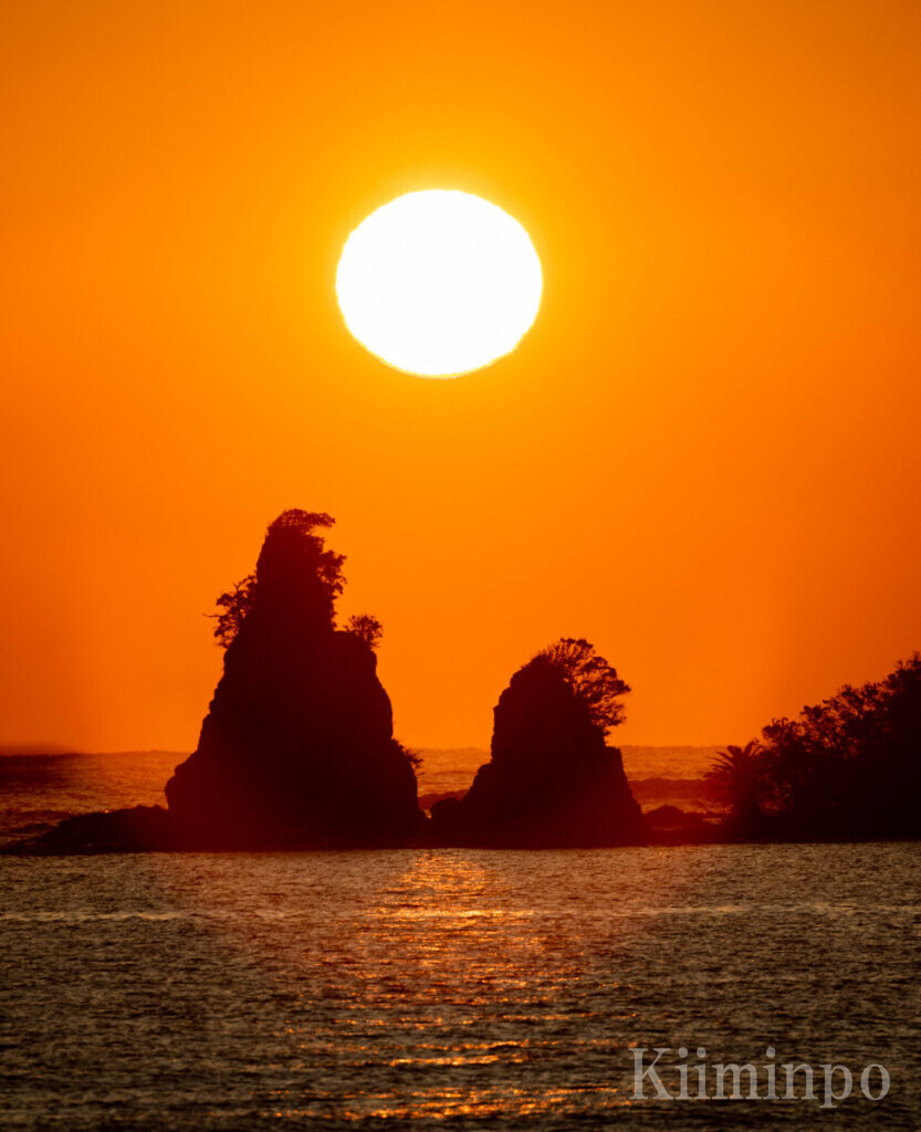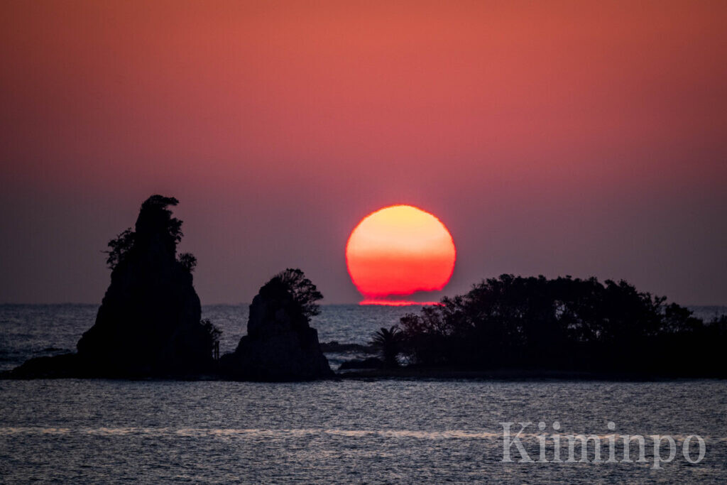 那智の浜ではこの季節、弁天島の後ろから上がる朝日を見ることができます。弁天島を「ゴジラ」に見立てて構図を決めるのも一興です。
