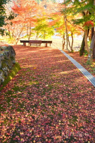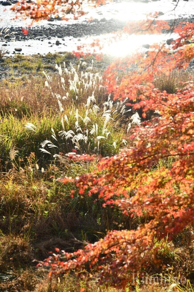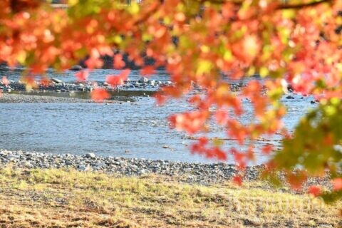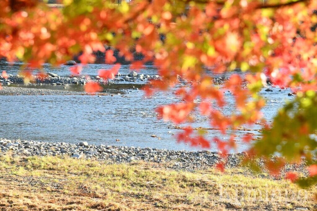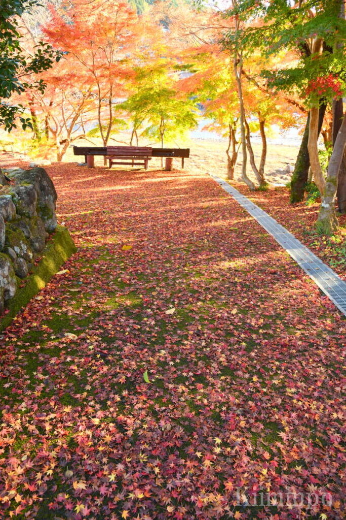 熊野古道・中辺路の近露王子は、日置川のほとりにあります。その対岸にはカエデの並木があり、美しい紅葉を見ることができます。
