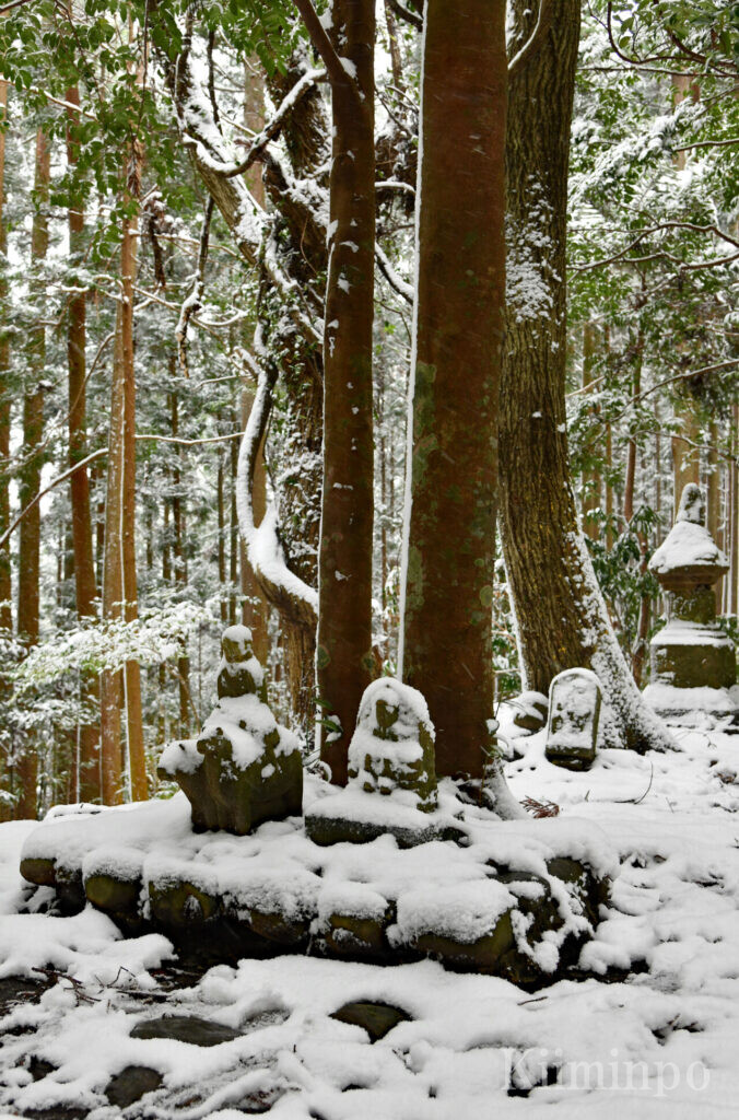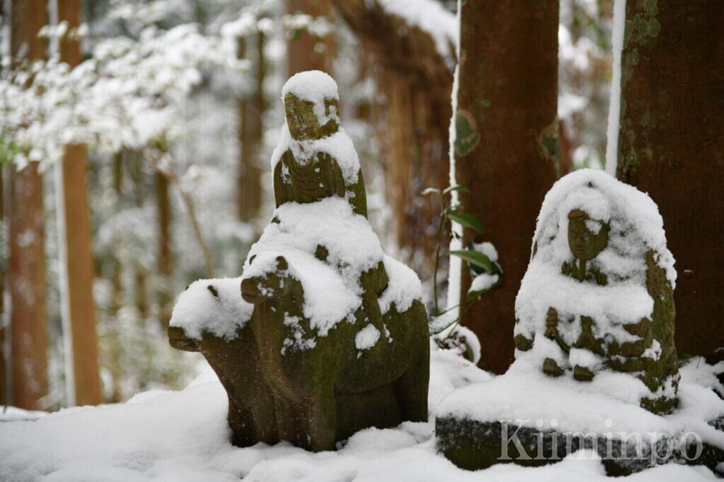 熊野古道・中辺路のシンボルの一つ、田辺市中辺路町近露の牛馬童子が雪化粧しました。