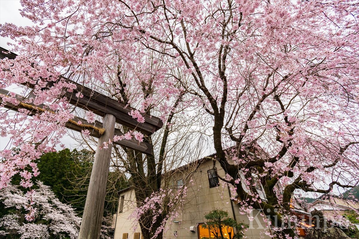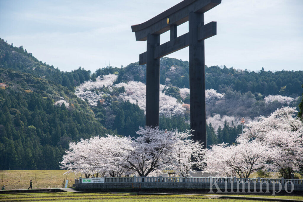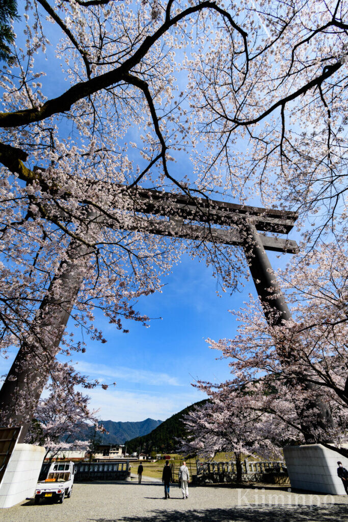 熊野本宮大社の旧社地、大斎原は桜の名所でもあります。とりわけ、日本一の大鳥居と桜の取り合わせは参拝者を魅了します。