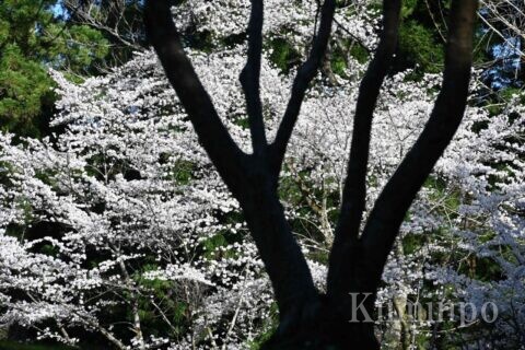 大鳥居周辺のサクラはやや開花が遅く、3月27日現在で7分咲きぐらい。