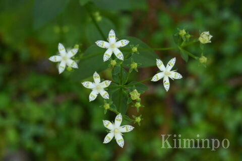 秋が深まると、熊野古道にもさまざまな花が咲きます。アケボノソウもその一つ。渓流沿いや湧き水のある所など、湿気のある場所を好みます。