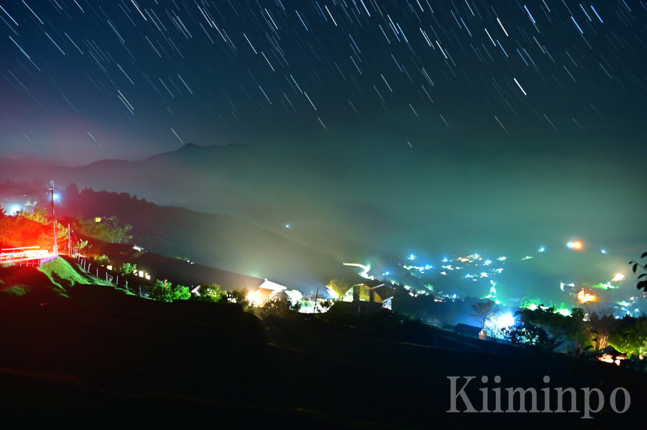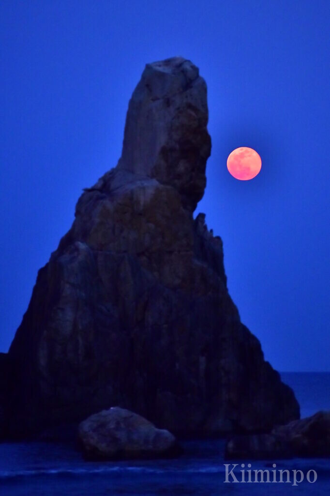 国の名勝・天然記念物にも指定されている串本町くじの川の「橋杭岩」。陸地から沖へ約850メートルにわたって大小40余りの岩柱が直線状にならんでおり、それぞれに「ハサミ岩」「大オガミ岩」などユニークな名前が付けられています。日の出の名所として有名ですが、満月との共演も見逃せません。