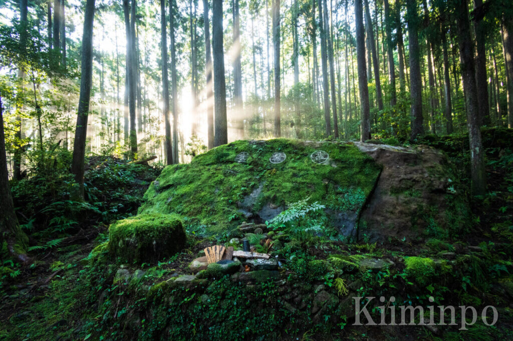 円座石(わろうだいし)は、熊野古道・中辺路の最大の難所、大雲取越(おおくもとりごえ)の途中にある巨石。昔、熊野の神々がその上で談笑したと伝わります。表面には、熊野三山の本地仏を表す三つの梵字(ぼんじ)が刻まれています。